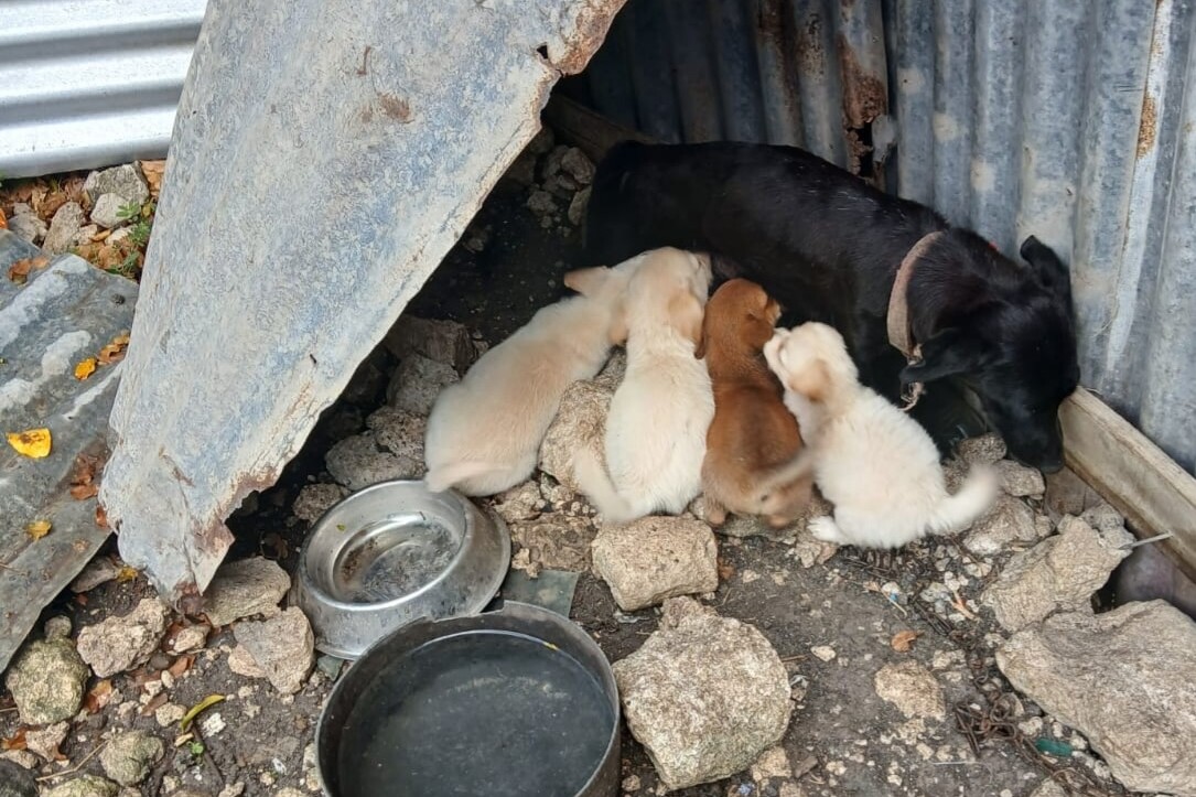 This mother dog and her five puppies were discovered abandoned—terrified and struggling to survive. Left to fend for herself in an impossible situation, she had no one to turn to.